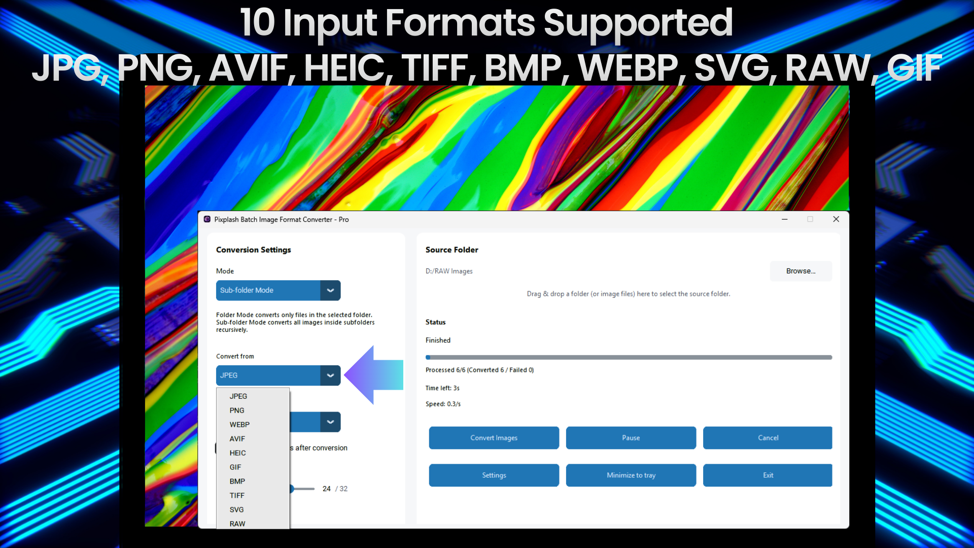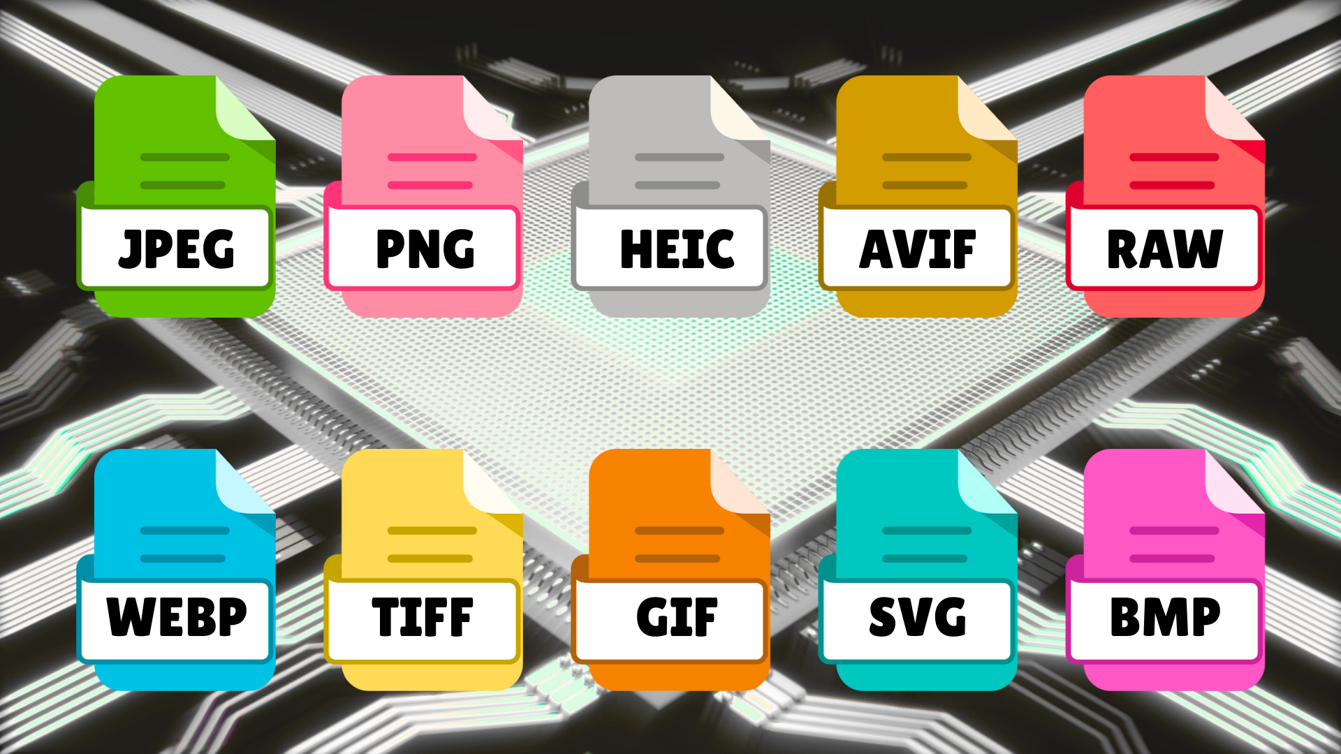 ✔️ JPEG, JPG, PNG, WEBP, AVIF, HEIC, HEIF, GIF, BMP, TIFF, SVG, RAW (45 Major RAW Formats Supported - CR2, CR3, NEF, ARW, ORF, RAF, RW2, DNG, GPR, etc.)